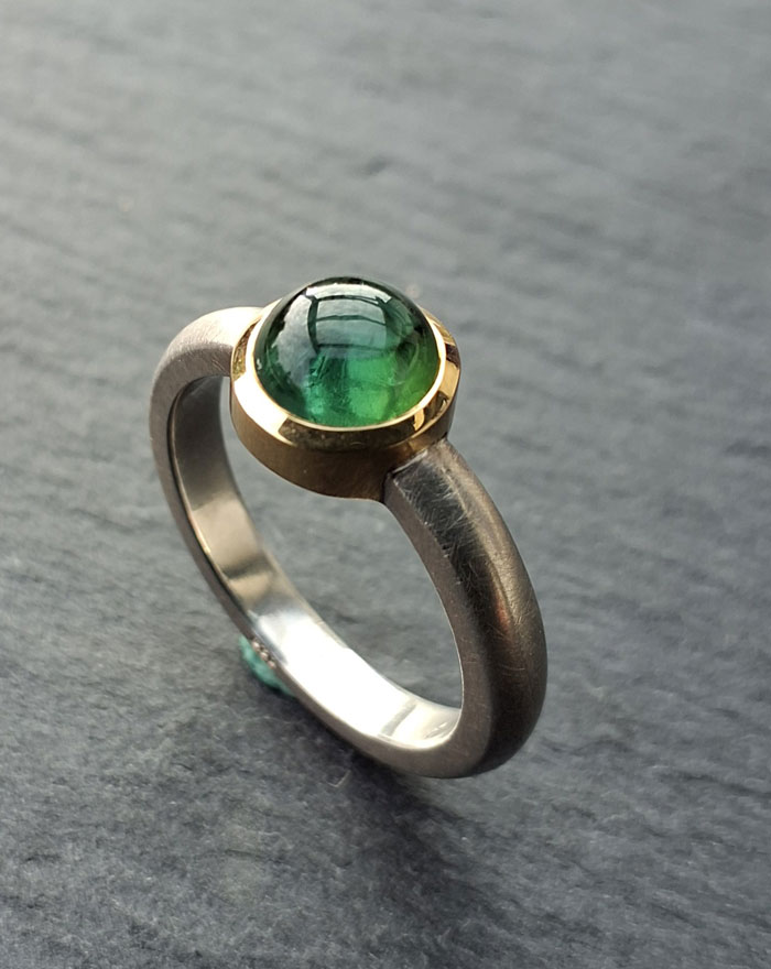 Der Ring ist in Silber 925/ gearbeitet, mit einem als Cabochon geschliffenem pink farbigen Turmalin besetzt. Die hier verwendete ornamentale Drahtbiegetechnik findet ihren Ursprung in der Filigranarbeit. In alten und traditionellen Filigranarbeiten werden gekordelte Drähte verwendet und Metallperlen aufgesetzt. Um meinen Schmuckstücken eine leichte und klare Note zu verleihen, verwende ich Runddrähte, die an den Berührungspunkten gelötet werden. Dadurch wirkt der Ring sehr leicht und luftig – eben filigran.